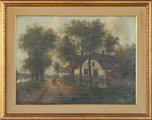 Village Landscape Scene Oil on Canvas, Early 20th Century, 28W x 22H - Cleared Art