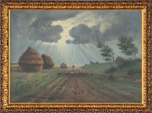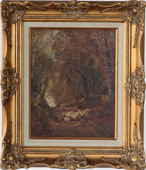 Antique European Oil Painting with Sheep Grazing 29W x 21H - Cleared Art