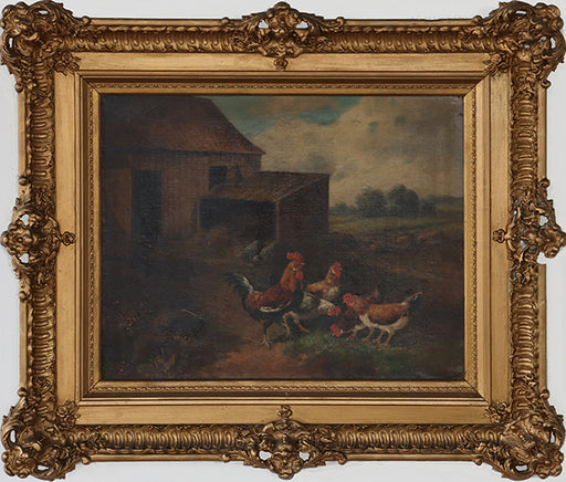 Rooster and Hen Landscape, Oil on Panel, 19th Century 29W x 25H