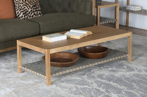 Natural Wood Coffee Table Woven Grey Leather Shelf