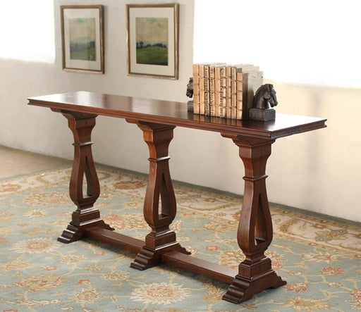 Dark Eucalyptus Wood Curved Console w/ Bronze Trim