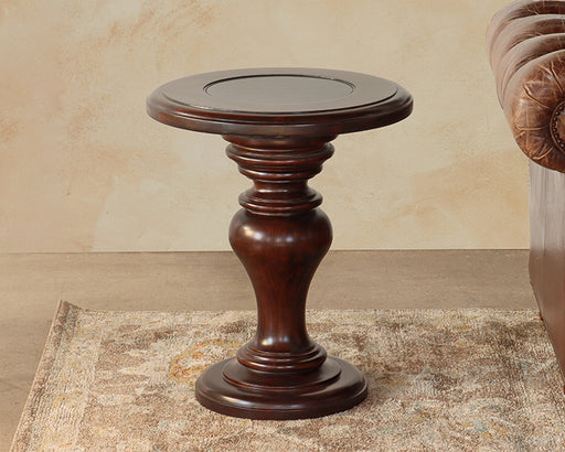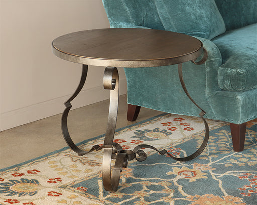 Round Cherry End Table w/ Embossed Metal Scroll Top