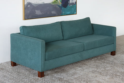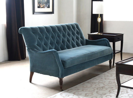 Curved Peacock Velvet Sofa with Tufted Back and Toss Pillows